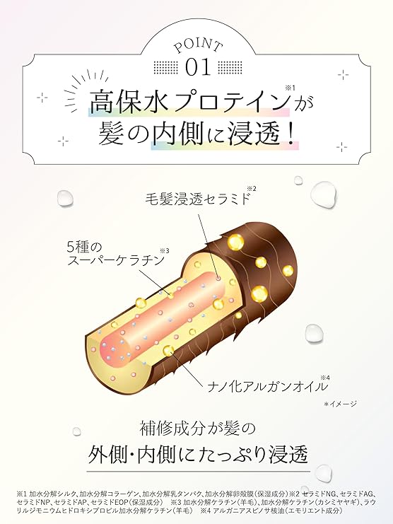 Water, Stearyl Alcohol, Sorbitol, Behentrimonium Chloride, Dimethicone, Arganian Spinosa Nuclear Oil, Lauryl Dimonium Hydroxypropyl Hydrolyzed Keratin (Wool), Hydrolyzed Keratin (Cashmere Goatin), (Dihydroxymethyl Silyl Propoxylpropoxylpropoxyl) Hydroxypropyl Hydrolypropyl Hydrolypropyl Hydrolypropylene Hydrolyzed Keratin (Keratin (Wool), Keratin (Keratin (Wool), Keratin (Keratin (Wool), Keratin Rattin, Ceramide NG, ceramide AG, ceramide NP, ceramide AP, ceramide EOP, hydrolyzed silk, hydrolyzed collagen, hydrolyzed protein, hydrolyzed egg shell membrane, polyquateranium-61, dysterylyldimonium chloride, quotanium-33, cholesterol, hydroxyethyl cellulose, arginine, glutamate PG, BG, G. Serin, Ethanol, Isopropanol, Caramel, Phenoxyethanol, Fragrance