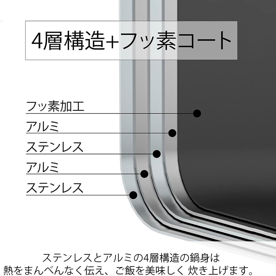 - Quadruple-Layer Construction: The pot features a meticulously engineered structure of stainless steel and aluminum. This unique four-layer body ensures perfectly even heat distribution, cooking each grain of rice thoroughly for a consistently soft, delicious, and fluffy result.