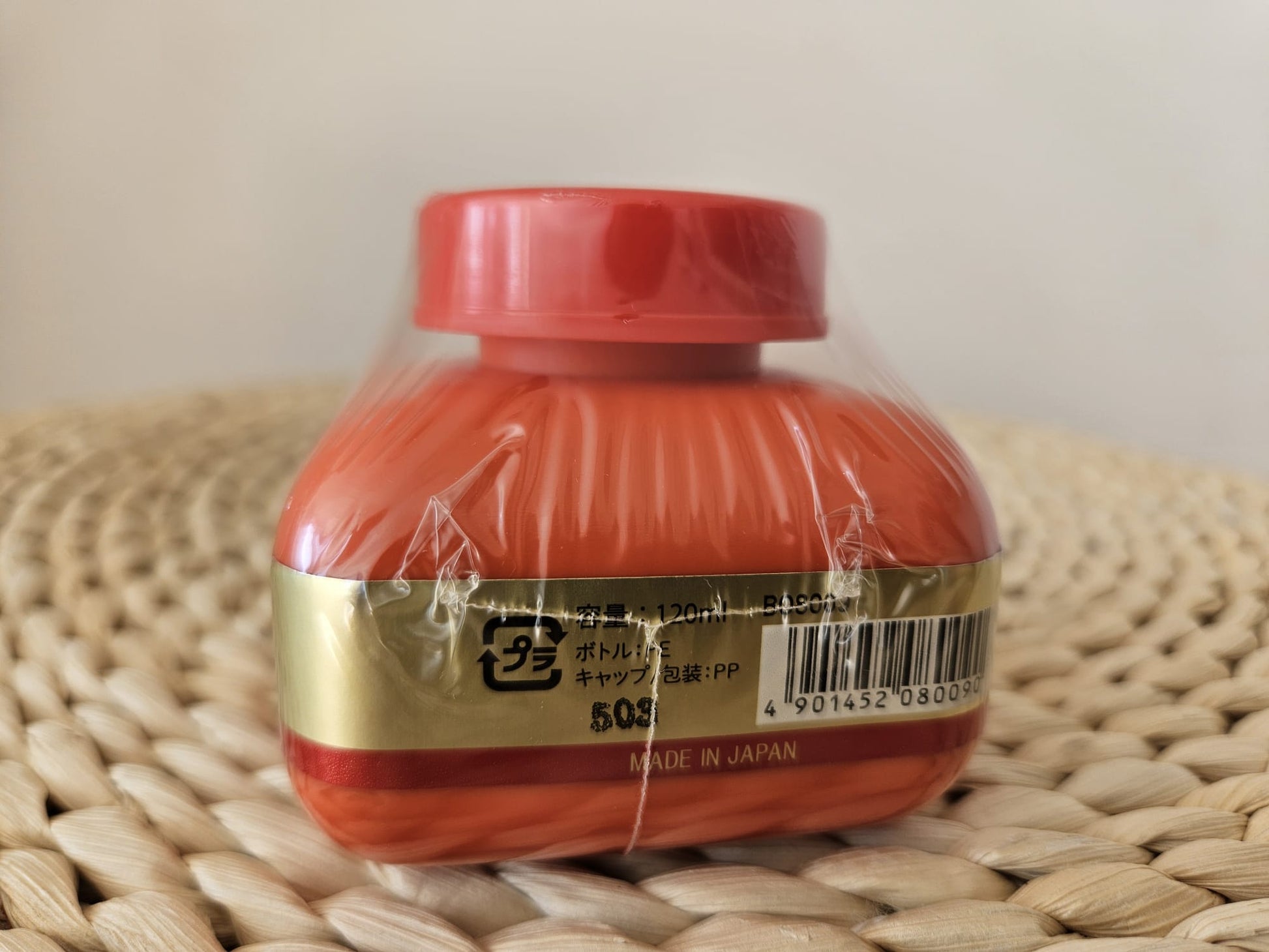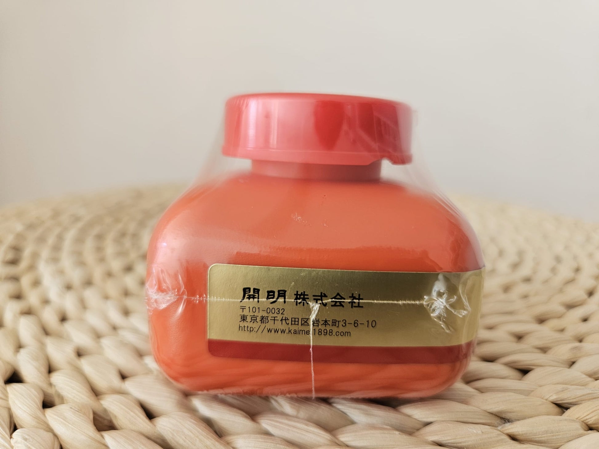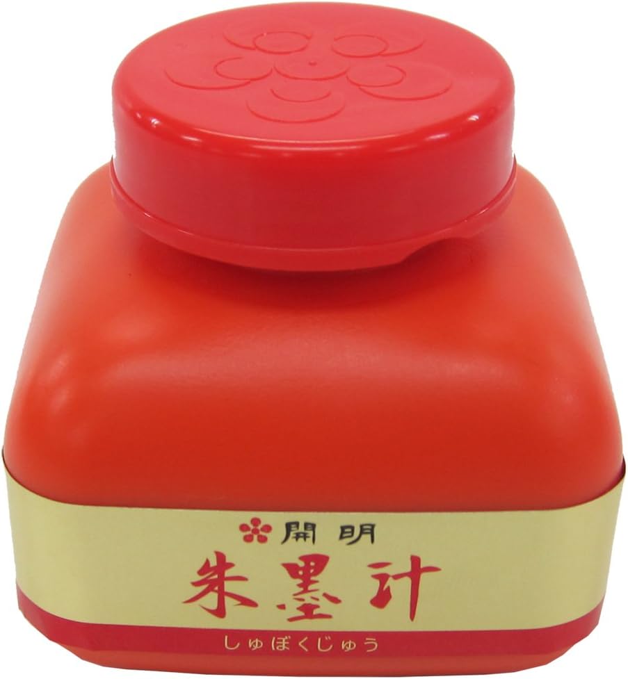 This is a 120ml bottle of Kaimei Japanese Chinese calligraphy ink in vermillion red. Suitable for calligraphy and drawing, this Boku eki ink is perfect for traditional Shodo art. This product is a liquid ink that provides high flexibility and gloss, and has a vivid mark even when used as light ink.