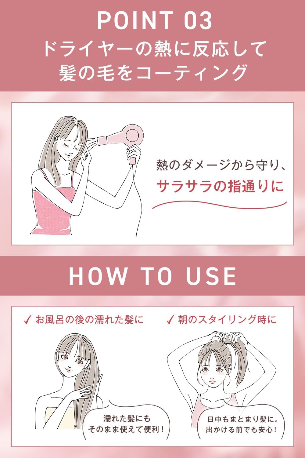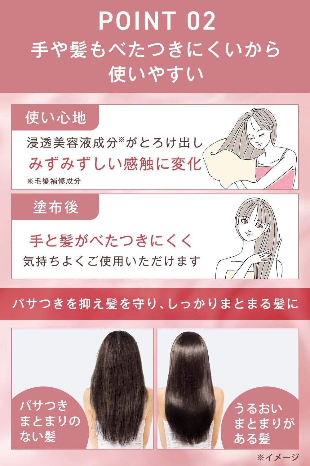 This non-rinse treatment keeps your hair moisturized, healthy, and beautiful. Unscented type that does not interfere with other hair care scents