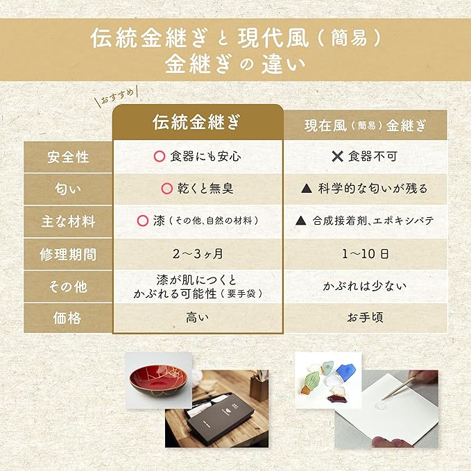 - simple kintsugi using traditional gold splitters that are made from ancient natural materials and the recently introduced synthetic adhesives.