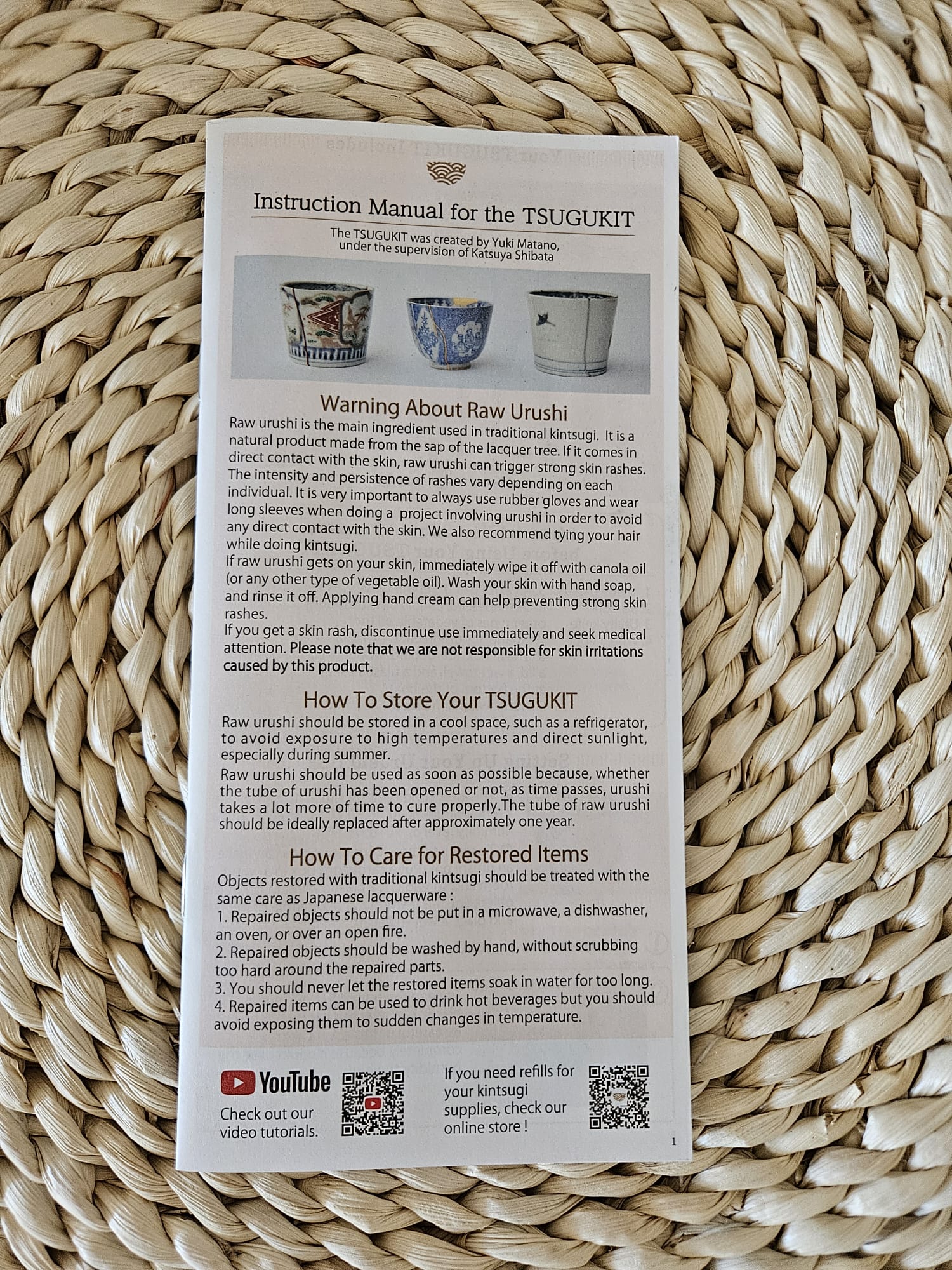 This TSUGUKIT Kintsugi repair kit is perfect for beginners who want to learn the art of Japanese pottery repair. The kit includes an English manual and all the necessary materials to repair a small gold powder figurine. The Urushi Instruction aspect of this kit is Japanese/English language.